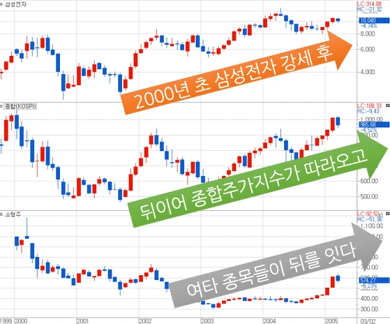[2000년 초반 삼성전자가 증시에 길을 뚫은 후 뒤이어 여타 종목들도 따라왔다]