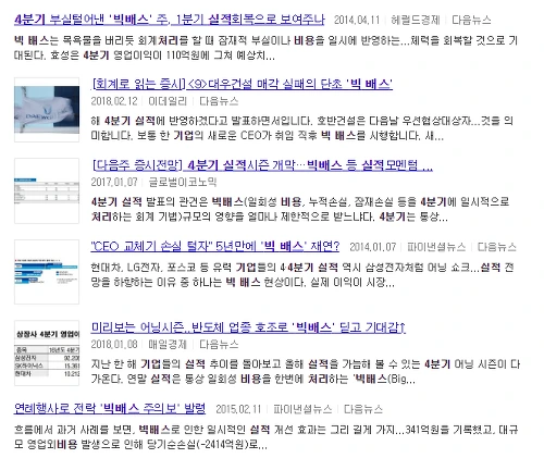포털사이트에서 "4분기 빅배스"로 뉴스 검색을 해 보아도 매년 엄청난 양의 기사가 쏟아진다는 것을 확인할 수 있습니다. 아예 상장사들의 관행처럼 되어있고 증권사 애널리스트들은 이러한 기업들의 관행 때문에 이익 추정에 애를 먹는 일이 다반사입니다.
