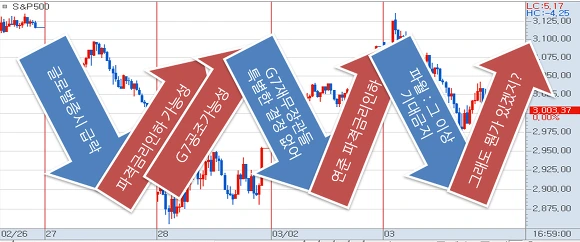 2월 28일 금리인하 가능성에 급락 후 환호로 바뀐 이후 3월 2일에는 G7재무장관 회의 기대감에 사상 최대치 수준의 증시 급반등 그런데 이후 G7재무장관 회의에서 별것 없다는 분위기가 만들어지면서 불안감이 어제 한국증시와 아시아권증시에 압박요인이 되었는데 연준의 예정에도 없는 50bp금리인하로 시장이 급반등하였지요. 그런데... 그런데!! 파월의장이 "더 이상의 금융정책 없뜸!"이라고 하였다고 바로 또 급락. 그리고 오늘 아침 그래도 무언가 나올지도 모른다는 기대감에 한국 및 아시아증시 급반등
