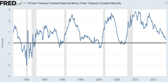 미국의 10년 장기 국채 금리와 2년 단기 국채 금리간의 스프레드는 올해 금융시장과 주식시장에 뜨거운 화두로 등장 해 있습니다. 미국의 경기 회복 속에 기준 금리를 지속적으로 인상하면서 단기금리가 장기 금리 상승 속도보다 빨리 상승하며, 이제는 30bp아래로 내려와 있습니다. 연준이 한번 더 금리 인상을 할 경우 시장 분위기에 따라 바로, 역전이 될 수도 있는 상황입니다.