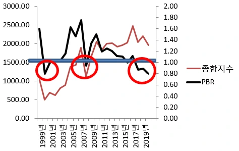 위의 시장PBR레벨과 종합주가지수 차트를 보시면 유가증권시장의 PBR레벨은 2008년, 2000년 수준까지 레벨다운 되어 눌려있습니다. 미중 무역전쟁 이슈로 지난 2년 눌린 후 다시 튀어오르려던 차에 이번 코로나19를 만났다보니 현재 상태로는 추가적으로 눌려있습니다만, 어쩌면 이 수준은 2010년대 내내 사람들이 그리워하던 밸류에이션 레벨인 2008년 그리고 2000년대 중반 상승장에서 투자자들이 그리워하던 2000년 IT버블 당시의 밸류에이션 아닐까요?