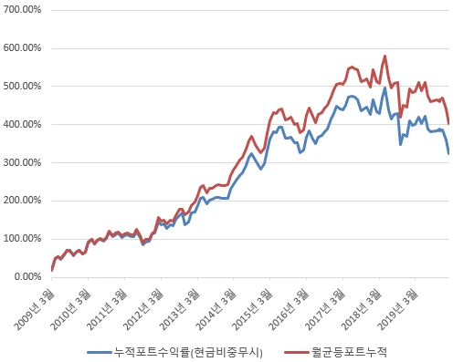 한달에 한번 비율을 재세팅한 포트폴리오가 더 높은 장기 성과를 만들었음을 확인할 수 있습니다.