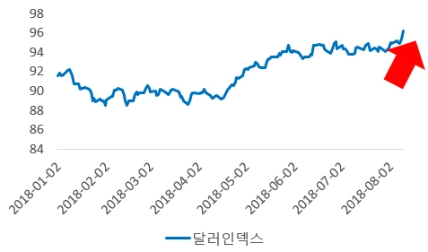 가뜩이나 미중 무역전쟁으로 조마조마한 상황에서 간신이 안정을 찾을듯한 분위기가 만들어지고 있었는데, 이렇게 터키 리라화가 급락하니, 글로벌 금융 시장 심리에 영향을 미치게 되었고, 그 결과 달러 가치가 하락 해야지만 금융 시장이 안정을 찾는 하나의 단초로 삼을 수 있을터인데, 금요일을 기점으로 달러가치가 다시 치솟고 말았습니다.