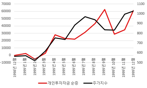 [1999년 당시 개인투자자금 순증과 주가지수 추이]