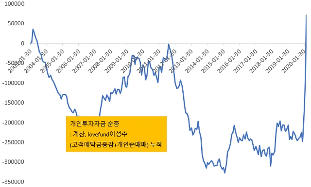 [개인투자자금 순증 추이 : 2003년~2020년 3월 20일, 계산추정 : lovefund이성수]