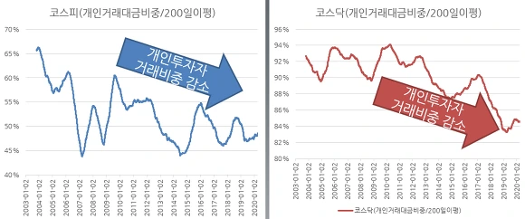 [2010년대 들어 개인투자자의 거래대금 비중은 계속 하향추세였다]