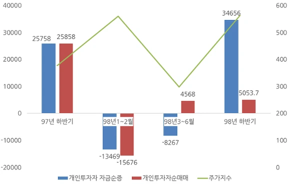 [IMF당시 97년과 98년 개인투자자금의 순증과 순매매 그리고 주가지수 추이]