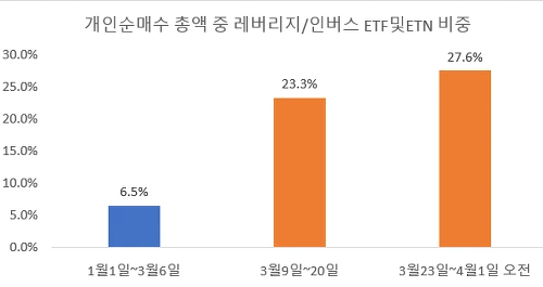 특히 3월 23일 2030세대 투자자들이 급증한 이후로는 단일방향으로 베팅하는 레버리지ETF와 인버스ETF의 순매수 비중이 급격히 높아진 것입니다.