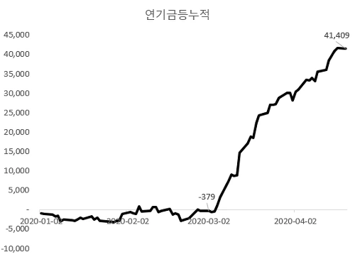[연기금등의 2020년 누적순매매 추이 3월 이후 매수세가 눈에 띄다. 코스피+코스닥 합계]