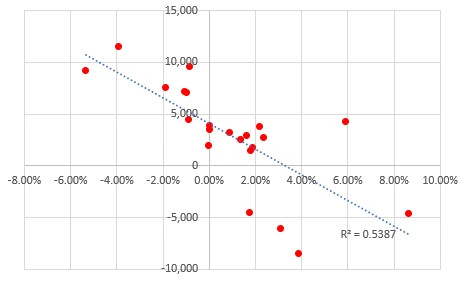 이를 한눈에 알아보기 쉽게 점도표로 만들어 보았습니다. 주가지수 등락률과 개인의 코스피 일간 순매매를 함께 표시하여보니 증시가 하락할 수록 더 큰 금액을 사고 있는 현재 증시 상황을 그대로 확인할 수 있었습니다.