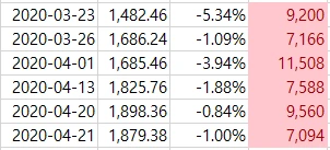 3월 23일 본격적인 반등장이 시작된 이후 개인이 5천억원이상 유가증권시장에서 순매수한 경우는 주가지수가 큰폭의 하락을 만들었을 때입니다. 이는 증시가 하락하기만 하면 줍줍하며 사들이겠다는 개인의 현재 심리가 그대로 반영되어있다 하겠습니다.