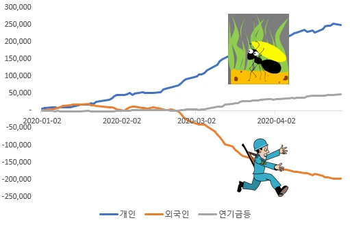 이번 코로나 사태가 본격화된 2월 초 이후 현재까지 외국인이 코스피 코스닥 양시장에서 매도한 물량은 21조5천억원에 이릅니다. 엄청난 규모이고 지금도 거의 매일 매도 물량을 쏟아내고 있습니다. 3월 코로나사태와 금융시장 불안이 피크에 이를 때 외국인은 하루에 1조원단위에 천문학적인 매도 물량을 쏟아내면서 시장을 공포감에 몰아넣었습니다.