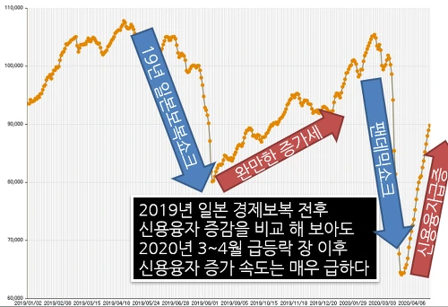 그런데 예전 같으면 큰 폭락장이 있고나면 신용융자 증가 속도가 느려집니다. 한번 크게 데였으니 겁이 나는 것이지요. 하지만 3월 큰 폭락장을 거친 후에도 불구하고 3월 23일 반등장이 시작된 이후 신용융자 증가속도는 매우 가파릅니다.