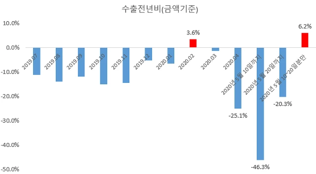 하지만, 3월 코로나 사태가 심화된 이후 수출은 다시 감소세로 전환되었고 4월에는 -25.1%까지 수출이 감소하였습니다. 이런 분위기는 5월 초까지 이어져 5월 1~10일 구간에서는 -46.3% 수출 감소가 발생하였고 시장에 잠시 "눌림"현상을 만든 원인이 되었습니다.