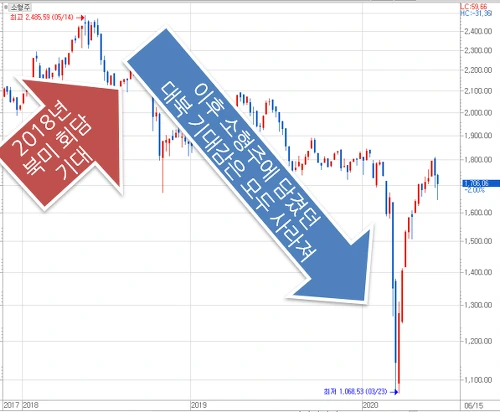 하지만 지난 2018년 6월 북미정상회담 이후 특별한 성과가 없자 스몰캡이 무너지는 원인이 되었고 2019년 일본의 경제보복 장세 속에 소형주들의 하락이 깊어지면서 2018년에 찐하게 반영되던 대북 기대감은 모두 사라지고 말았습니다.