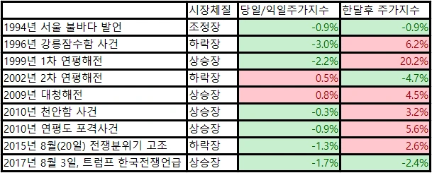 94년부터 최근까지 굵직한 북한의 도발 혹은 일촉즉발의 긴장감이 발생하였을 때 직후 당일 또는 익일의 주가지수 등락률 그리고 한달 후 주가지수 등락률을 위의 표로 만들었습니다.