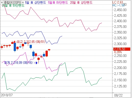 이를 차트에 구현하여보면 위와 같이 차트가 그려집니다. 시간 관계상 더 공식 작업을 못하였다보니, 지표 구현이 이쁘지는 않지만, 대략적으로라도 신뢰도 95%에서 5일 후의 주가 예상 확률반경과, 20일 후의 주가 예상 확률 반경을 그려볼 수 있습니다.
