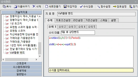 위의 그림은 증권사HTS 차트에 있는 수식관리자 화면입니다. 여기에서 새로만들기를 누르고 VaR활용밴드라 저는 사용자 지표를 만들었습니다.