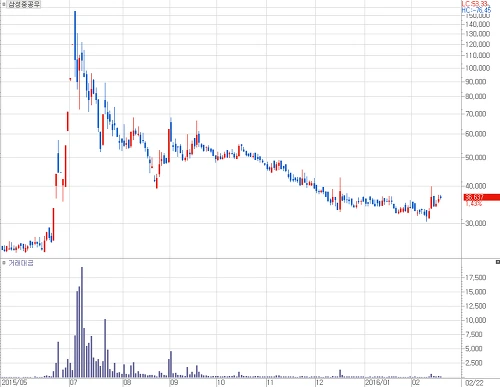 [2015년 삼성중공업 우선주 이상급등 당시 상투에서 거래량이 터지고 주가는 급전직하한다]