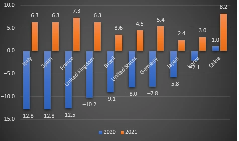 [IMF가 전망한 세계 주요국가들의 2020년과 21년 경제성장률 예측치, 자료참조 : IMF]