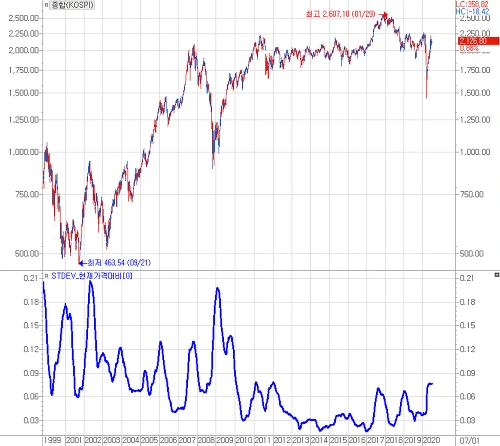 과거 2000년대 증시 변동성은 어마어마 했습니다. 개별 종목단위로는 말할 것도 없고 주가지수가 한해는 따블 상승, 한해는 반도막 나는 상황이 반복되었지요.