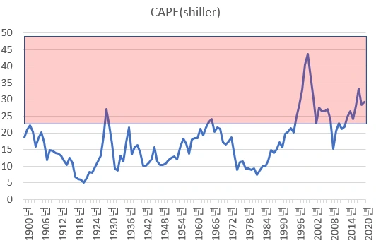 [쉴러 교수의 CAPE지표는 이미 과거 버블권역에 미국증시가 있음을 알리고 있다]