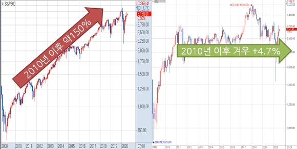 2008년 연말, 금융위기 이후 2010년 연말까지만 하더라도, 한국증시는 82% 상승하면서 미국 S&P500지수 상승률 40%수준보다도 2배 넘는 상승률을 기록하였습니다. 지금처럼 일방적으로 한국증시가 뒤쳐지지는 않았었지요. 하지만 2010년 연말부터 10년이라는 시간동안 코스피 종합주가지수는 겨우 5%도 안되는 상승률을 기록하는 동안 미국증시는 150%가까운 상승률을 기록하면서 상승률 자체의 숫자로는 30배나 차이가 만들어 졌습니다.