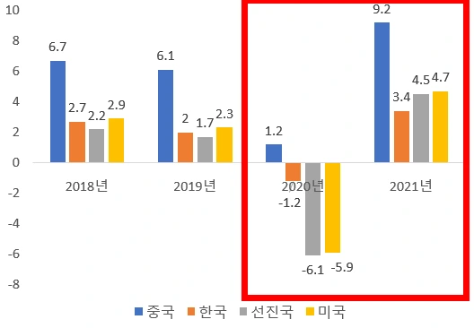 [선진국과 미국의 올해 치명적인 역성장이 예상되지만 한국과 중국은 매우 양호할 것으로 전망]
