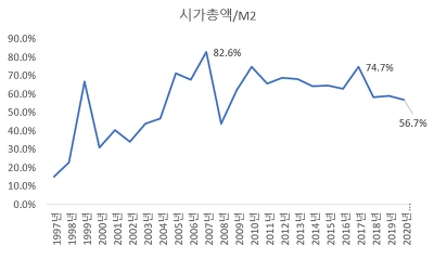 [한국증시 시가총액을 M2로 나눈 비율은 아직도]