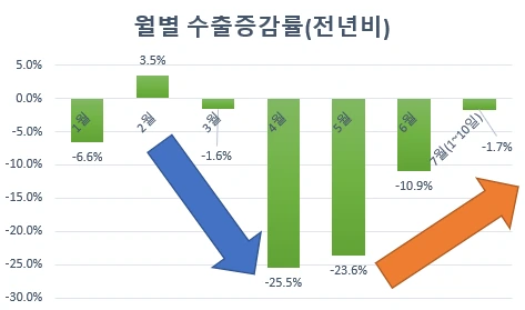 하지만, 6월부터 수출증감률이 빠르게 턴어라운드하기 시작하면서 전년동기비 -10.9%로 빠르게 회복하기 시작하였습니다.