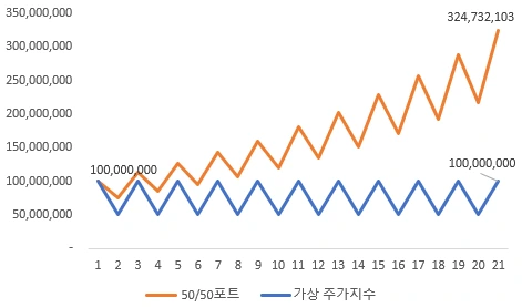 [50vs50 전략으로 리밸런싱만 하여도 가상의 극단적인 증시에서도 저절로 수익이 증가한다]