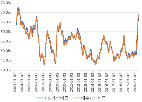 문득 오늘 아침 현재 개인투자자의 매수 또는 매도 금액이 전체 수급들이 형성하는 거래대금에서 어느정도의 비중일지 궁금하더군요. 그래서 2003년 연초부터 최근까지 매도시 개인의 거래대금 그리고 매수시 개인의 거래대금을 조사 한후, (개인+외국인+기관)의 매도(또는 매수)시 거래대금 합계액에서 개인의 거래대금이 차지하는 비중을 조사하여 보았습니다.