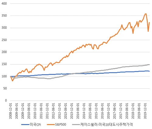 [미국CPI와 S&P500지수 그리고 케이스쉴러-미국20대도시주택가격지수, 원데이타 : FRED]