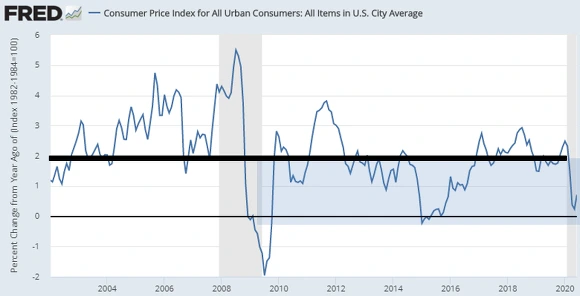 [미국 CPI추이 2008년 금융위기 이후 월간기준 전년비 2%를 넘기기가 쉽지 않다, 자료 : FRED]