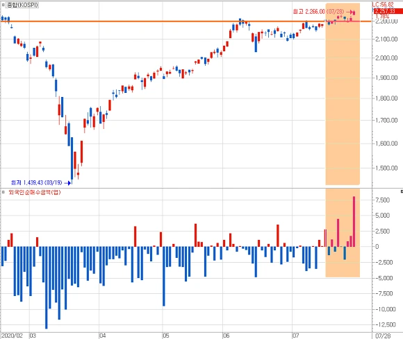 [코스피 지수와 외국인 순매수 추이 주가지수 2200p를 넘자 외국인 매수는 본격화되다]