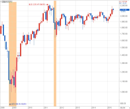 [2008년 금융위기 당시, 2011년 유럽위기 당시 공매도 금지 기간을 표시한 코스피지수]