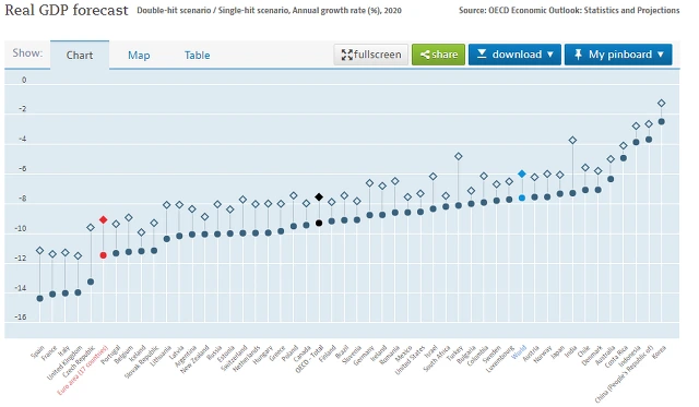 OECD의 Real GDP forecast 통계 자료를 열자마자 보였던 것이, 가장 양호한 수치를 보인 한국의 경제성장률 예측치였습니다. 코로나쇼크가 1번 충격으로 그칠 경우 -1.2%의 2020년 경제성장률을 두번의 코로나 쇼크 발생시 -2.5%의 경제성장률을 보일 것으로 OECD에서 예상하였습니다.