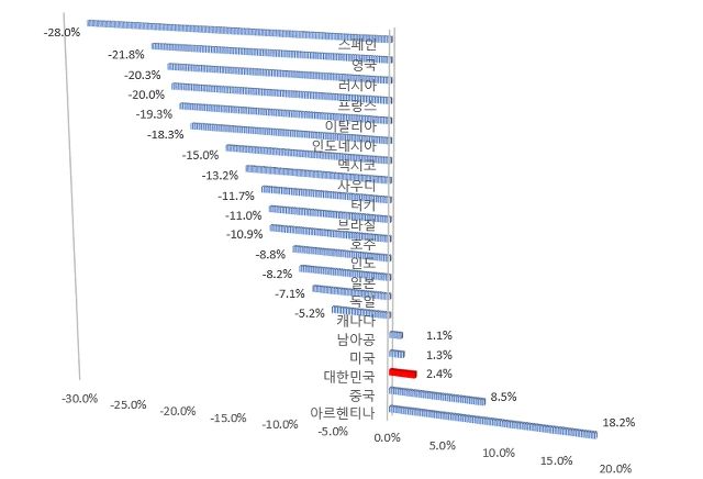 유럽 주요국가들은 -20%대의 폭락장을 2020년 7월까지 만들었습니다. 그나마 유럽중에서는 코로나를 잘 통제한 독일이 -7.1%하락한 정도이지만 G20 주요국가들의 낙폭은 매우 심각합니다.