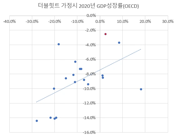 [더블히트 가정시 2020년 GDP성장률과 2020년 7월까지의 국가별 증시 등락률 적색점표시가 대한민국]