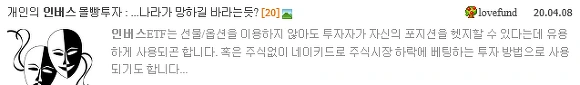 그렇게 사람들이 극단적인 비관론에 휩쌓여 인버스ETF와 곱버스ETF에 몰빵투자하는 것을 보면서 4월 8일 저도 평소보다 강한 글을 적었었습니다. "개인의 인버스 몰빵투자 : ... 나라가 망하길 바라는듯?"