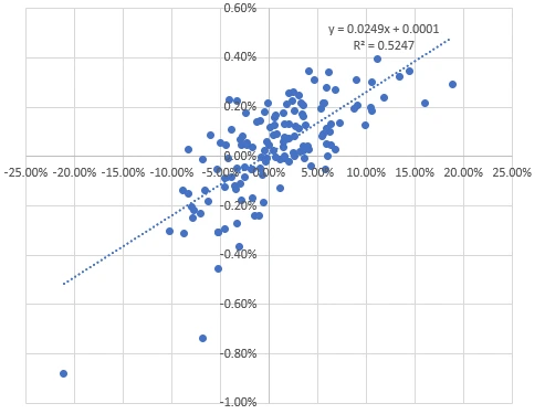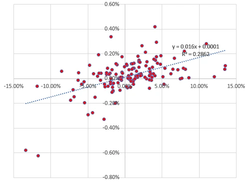 유가증권 시장은 코스닥시장에 비해 상대적으로 분포가 넓다보니 신용융자증감율의 주가지수 등락률 설명력이 떨어집니다. R스퀘어 값이 0.29 수준으로 코스닥 시장의 0.52에 비해 크게 낮아져있습니다.