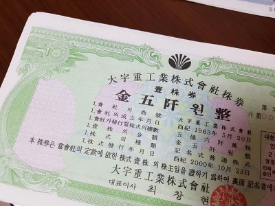 [필자가 현물로 가지고 있는 옛 대우중공업 주식 액면가 5천원이 찍혀있다]