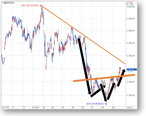 아직 강한 흐름은 아닙니다만 최근 종합주가지수의 흐름을 보게 되면 하락추세에서 전환되어가는 초기 형태를 만들고 있습니다. 7~8월에 형성된 고점대를 넘어서며 소위 역삼봉형 패턴을 만들어 가고 있는 것이지요.