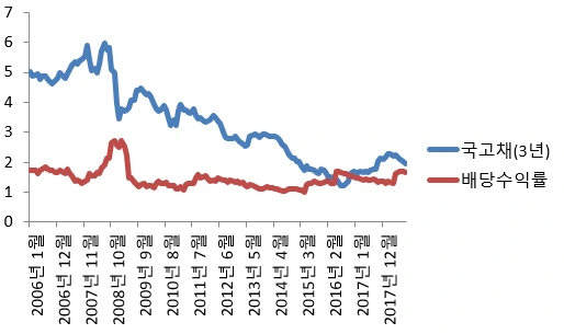 이를 비교할 수 있는 잣대로, 국고채 3년 금리(한국은행 통계)와 거래소 배당수익률(KRX통계) 자료를 비교하여 사용하곤 합니다.