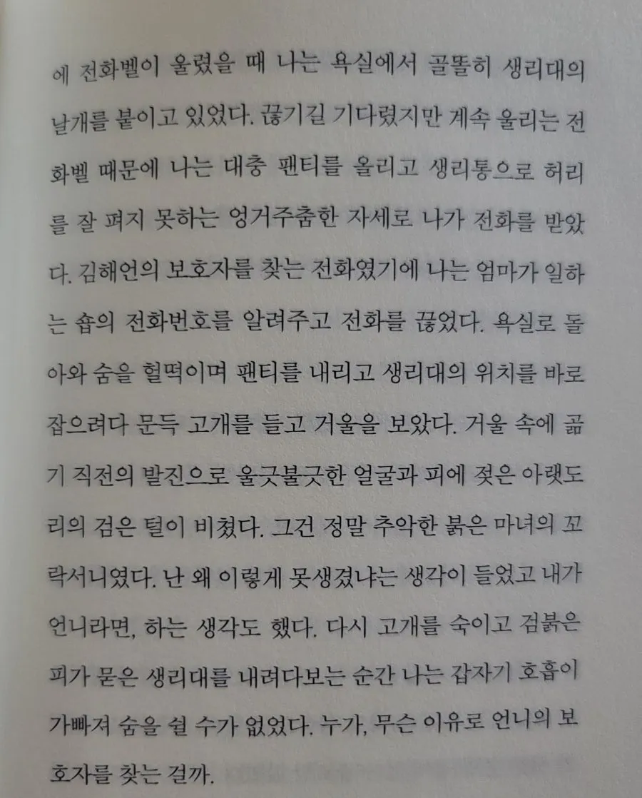 뭐랄까ᆢ 똑같이 생리하는 여성으로서 대리 수치심이 느껴질 정도의 현실적인 묘사인데 그래서 아무도 안보는 화장실에서만 저러고 있지만, 그꼴이 혹시나 거울에라도 비친다면 너무 싫을 것 같고, 내가 배출한 피의 빛깔도 냄새도 다싫은데 그걸 어쩌다보니 바라봤고, 하필이면 그때가 언니의 살인 소식이 막 들려왔을 때라는 배경과 또 기막히게 어울린다ㆍᆢㆍ