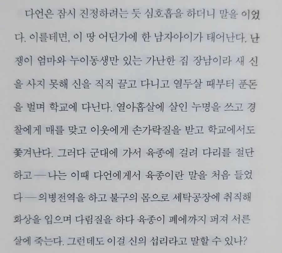 한만우와 같은 인물들의 생애가 메스컴에 방영될 때마다 나도 모르게 가슴이 답답해지고, 알 수 없는 미안함과 죄악감이 솟아오르면서, 이러고도 신이 있다고 말할 수있느냐고 하늘을 향해 쏘아대고 싶어지는데, 다언 역시 그런 감정을 말한다.