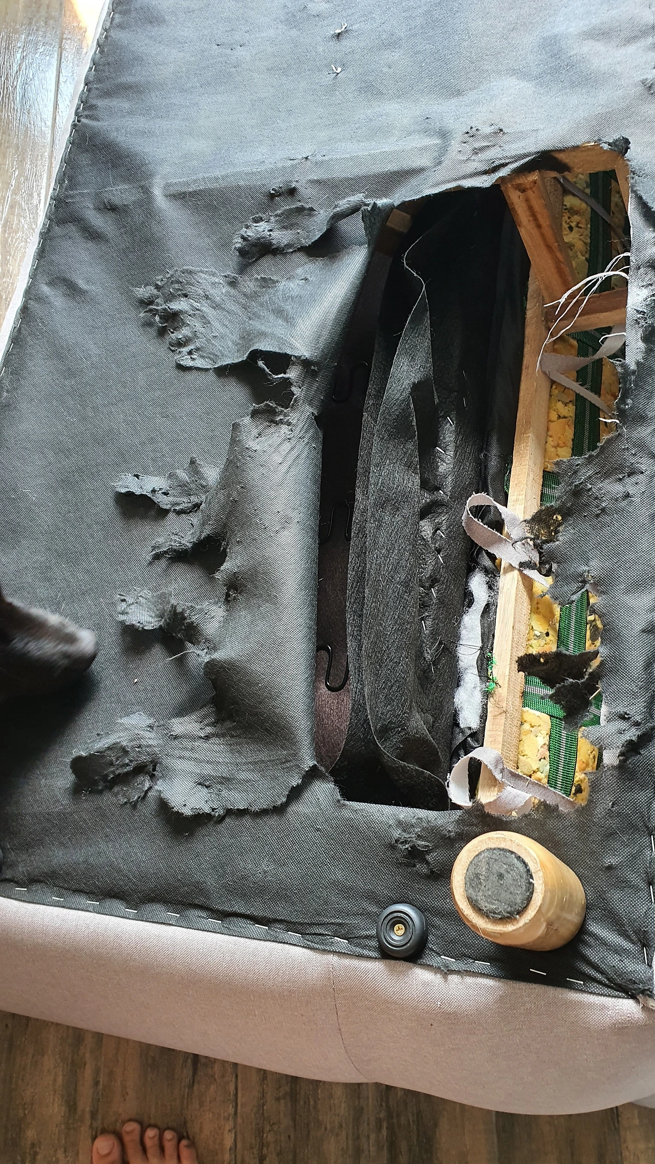 녀석은 이제 조금 더 큰 작업을 하고 싶었는지 내가 가장 오랜 시간을 앉아있는 소파를 박살 내기 시작했다. 녀석도 대놓고 작업을 시작하면 검거를 당할 것을 알았는지 눈이 닿지 않는 소파의 아랫부분부터 공략