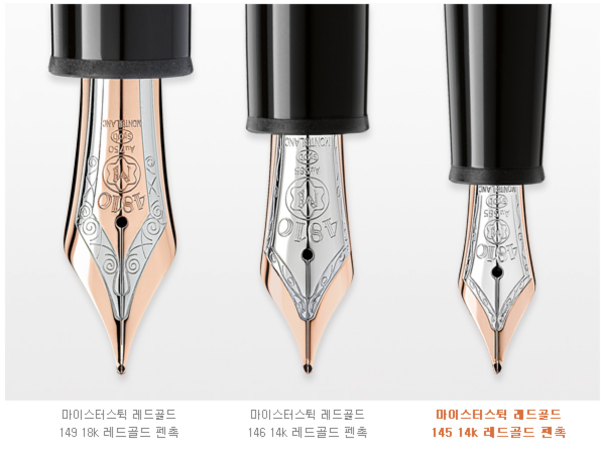 몽블랑 145의 펜 촉(닙)은 14K 금입니다. 무려 금을 쓰는 것에 놀라시는 분도 있습니다. 보통 만년필은 스테인리스 촉과 금 촉으로 나눌 수 있습니다. 스테인리스가 꾹꾹 눌렀을 때 휘는 정도가 약하고요. 금은 그 보다는 더 잘 휘겠지요?^^