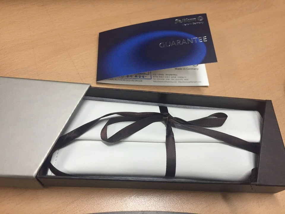 드디어 모습을 드러냅니다. 몽블랑과 다르게 펠리칸은 상품명과 색깔, 펜촉 사이즈를 매우 하나의 Tag에 친절히 표시해 두었네요. 다만 저런 봉지에 쌓여있는 모습은 고급스러움을 해치는 거 같습니다.