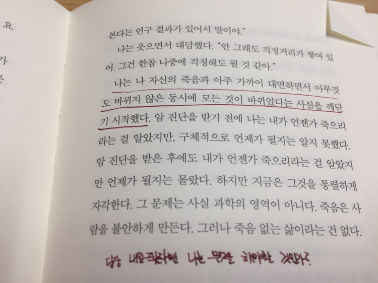 나는 나 자신의 죽음과 아주 가까이 대면하면서 아무것도 바뀌지 않는 동시에 모든 것이 바뀌었다는 사실을 깨닫기 시작했다.